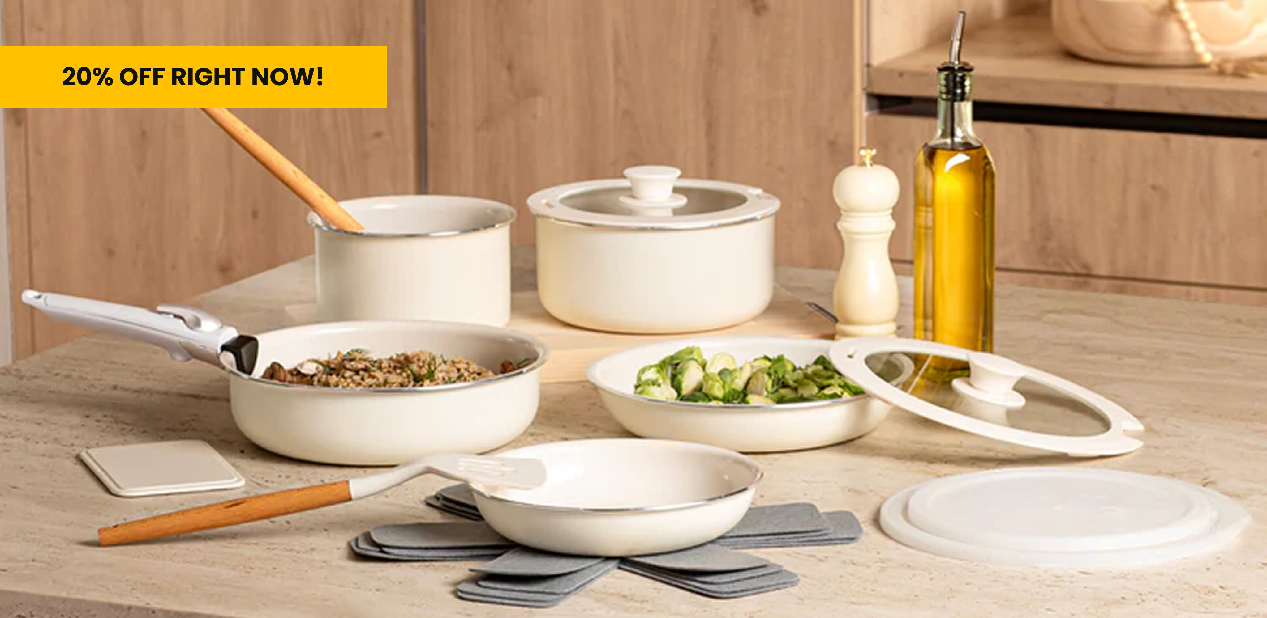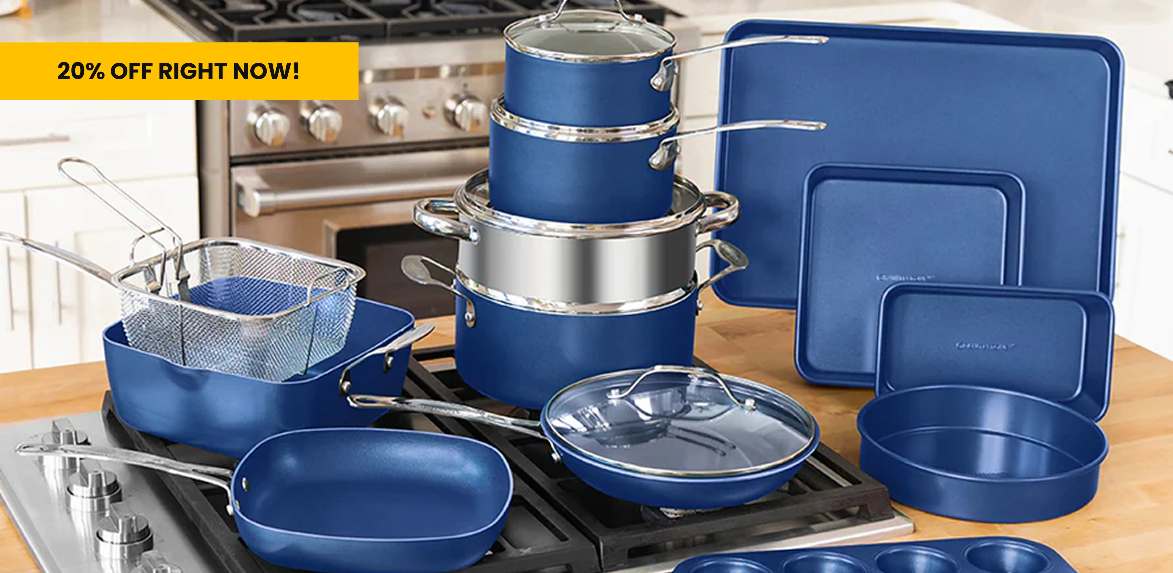 This complete 20-piece collection includes pots, pans, bakeware, and cooking utensils with triple-layer non-toxic coating that makes cooking and cleanup effortless. No more scrubbing stuck-on food for 20 minutes after dinner or worrying about harmful chemicals leaching into family meals.