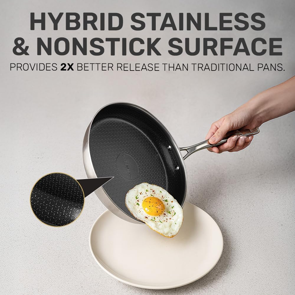 - ETCHED HYBRID SURFACE: Experience the perfect marriage of stainless steel durability and non-stick ease. Our etched hybrid surface allows you to sear meats to golden perfection while still releasing delicate foods like eggs and fish effortlessly—no more stuck-on mess.